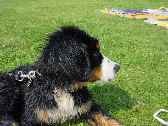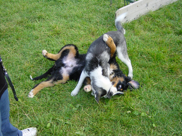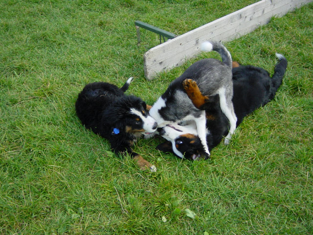 Spielen mit meinen Freunden: der Huskie-Dame und Balu, meinem Artgenossen.